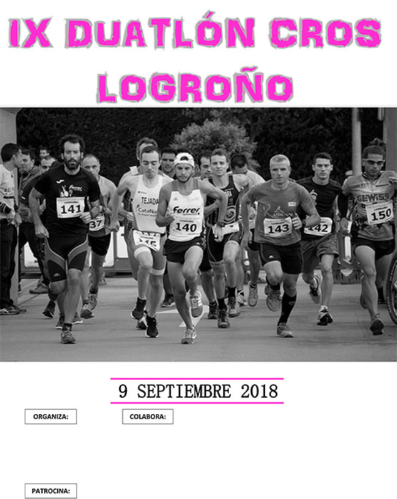 Logroño acogerá el 9 de Septiembre ( domingo) el IX Duatlón Cros Logroño,que tendrá lugar a las 10:00 de la mañana en el aparcamiento de Decathlón.Las inscripciones son de 14€ para federados hasta el 19/08 a las 23:59 y 19€ hasta el 5/09 a las 23:59 .Los no federados 22€ hasta el 19/08 a las 23:59 y 27€ hasta el 5/09 a las 23:59.