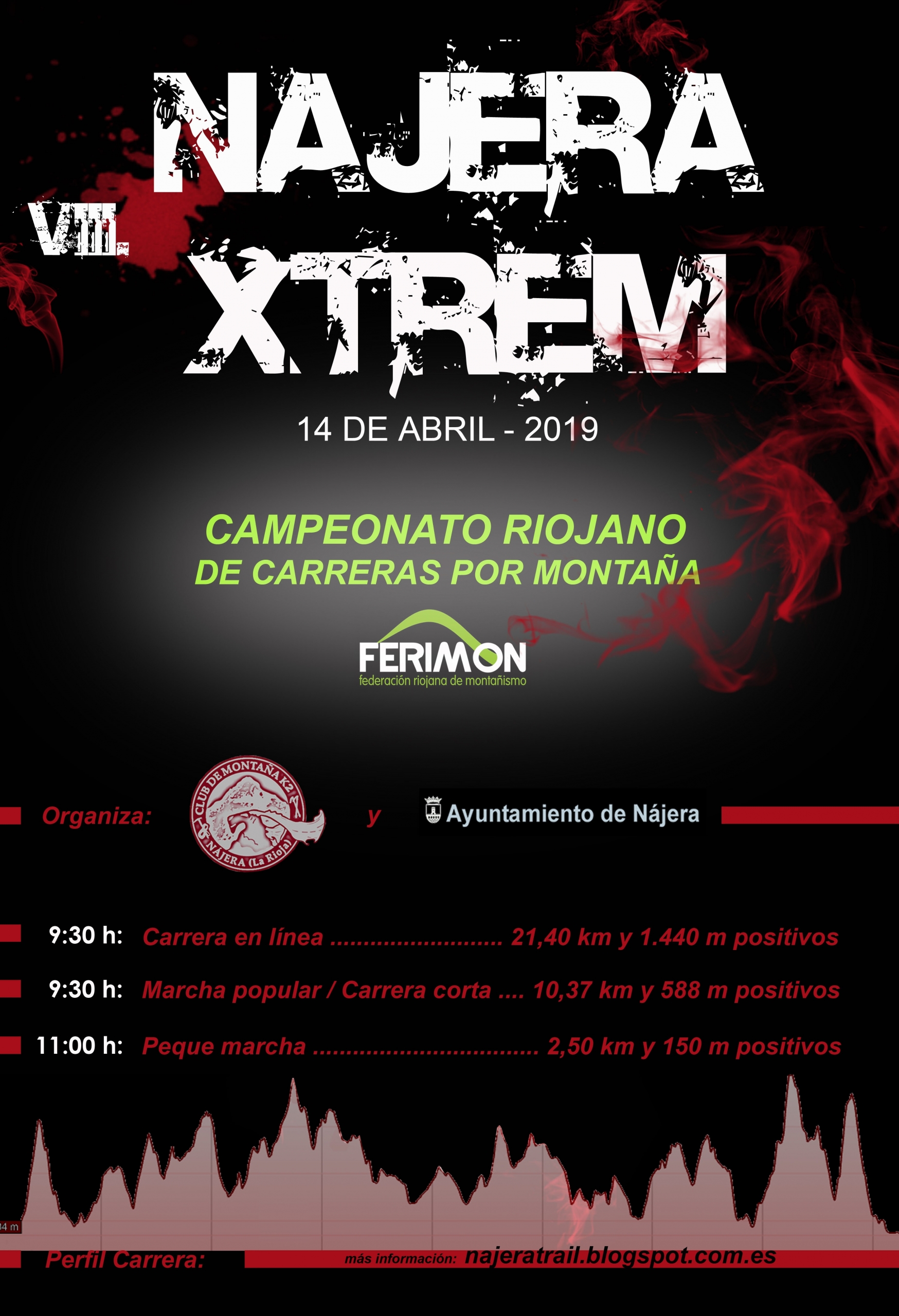 « Todos los Eventos Este evento ha pasado. VIII Nájera Xtrem. 14 abril, 2019 @ 08:30 - 14:00 12€ – 20.€ « 19ª Media Maratón Donostia San Sebastián. XI Carrera Popular Calahorra Ciudad de La Verdura. » + Google Calendar+ Exportación de iCal Detalles Fecha: 14 abril, 2019 Hora: 08:30 - 14:00 Precio: 12€ – 20.€ Categoría del Evento: Carrera Web: najeratrail.blogspot.com.es Organizador Club de Montaña K2 Nájera y Ayuntamiento de Nájera.