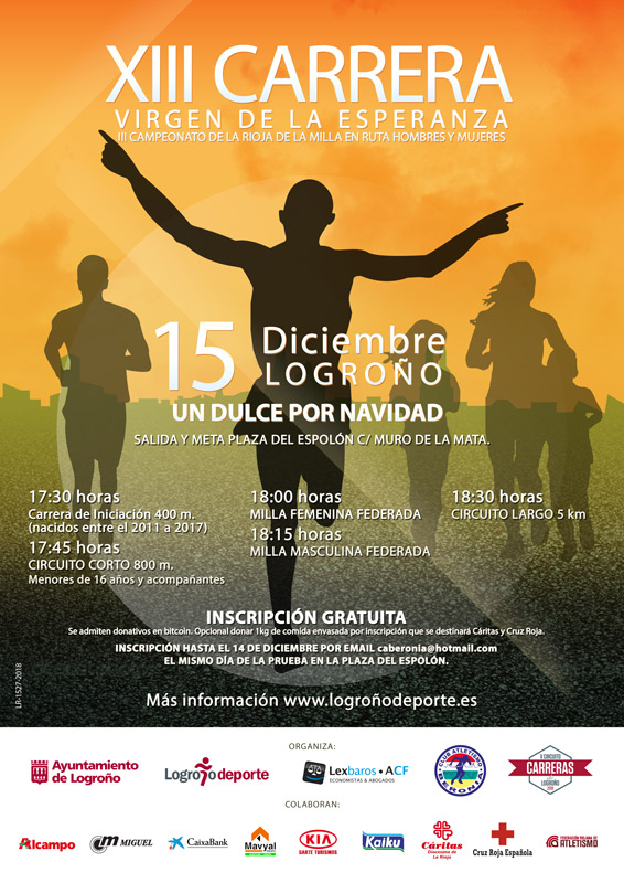 El 15 de diciembre (sábado) en el paseo de Del Espolón con C/Muro de La Mata a las 18:30 horas se celebrará la XIII Carrera Virgen de La Esperanza que a su vez,es Campeonato de La Rioja de Milla tanto masculina,como femenina para atletas con licencia federativa.La prueba es de 5 kilómetros en la prueba larga,aunque antes,desde las 17:30 hay prueba para categorías inferiores mas la milla.La incripción es gratuita y se admite un donativo de un kg de alimentos que se destinará a Cáritas y a Cruz Roja.