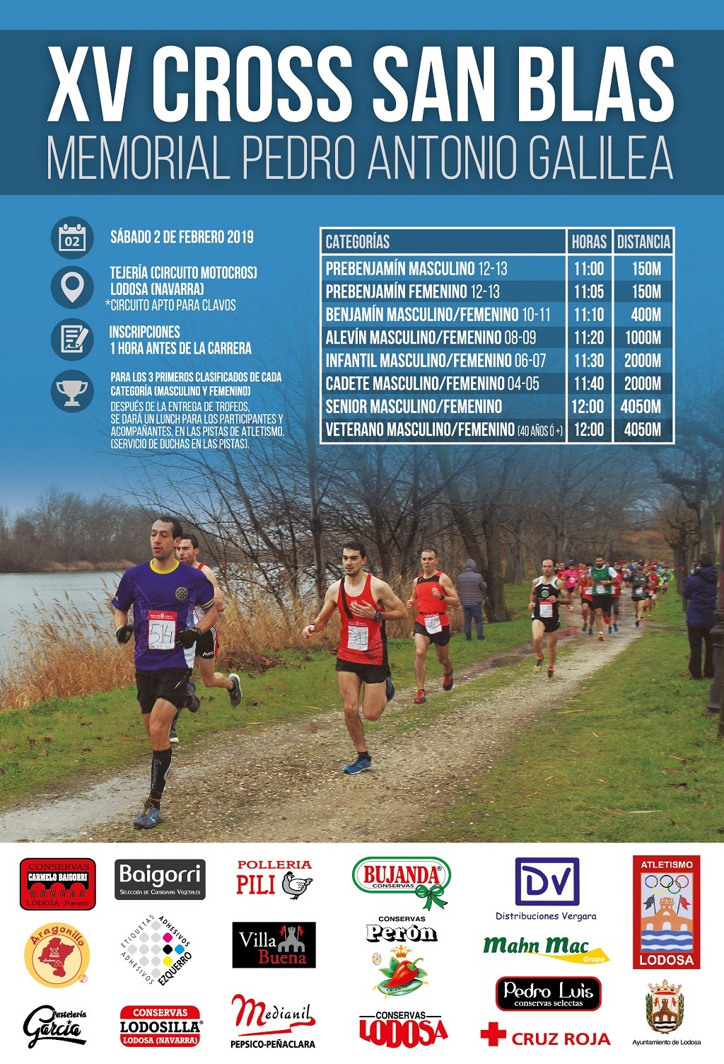 El próximo día 2 de febrero (sábado) desde las 11:00 horas,la localidad navarra de Lodosa acogerá el XV Cross de San Blas con carreras de todas las categorías,desde prebenjamín,hasta veteranos masculino y femenino.La inscripción es gratuita.Luego,tras la carrera y entrega de trofeos,se disfrutará de un lunch.