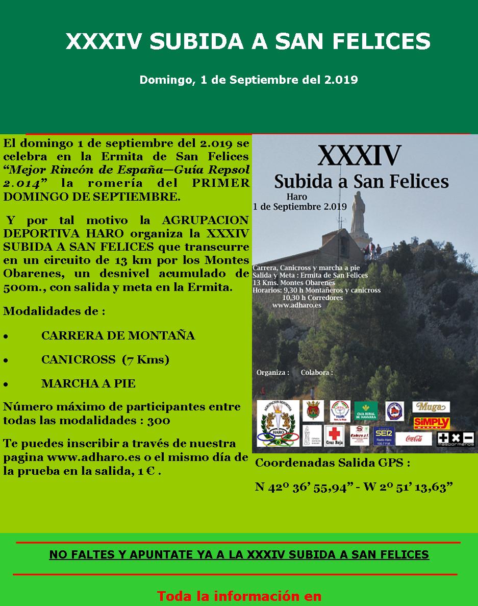 « Todos los Eventos Este evento ha pasado. XXXIV Subida a San Felices. 1 septiembre, 2019 @ 09:00 - 13:30 1€ « I Memorial de Marcha Nórdica Pablo Ariza. Trail Nutrium Villa de Ocón. » Organizada por A.D.Haro. + Google Calendar+ Exportación de iCal Detalles Fecha: 1 septiembre, 2019 Hora: 09:00 - 13:30 Precio: 1€ Categoría del Evento: Carrera Web: www.adharo.es. Local Hermita de San Felices (Haro).
