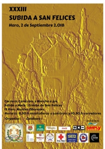 El día 2 de septiembre ( domingo) a las 9:30 de la mañana,Haro acogerá la XXXIII Subida a San Felices que constará de 13 kilómetros con salida y meta en la Ermita de San Felices.Tambien hay carrera de cani cross y marcha senderista.La marcha senderista y la carrera cani cross empezará a las 9:30,mientras que los corredores a pie empiezan a las 10:30.